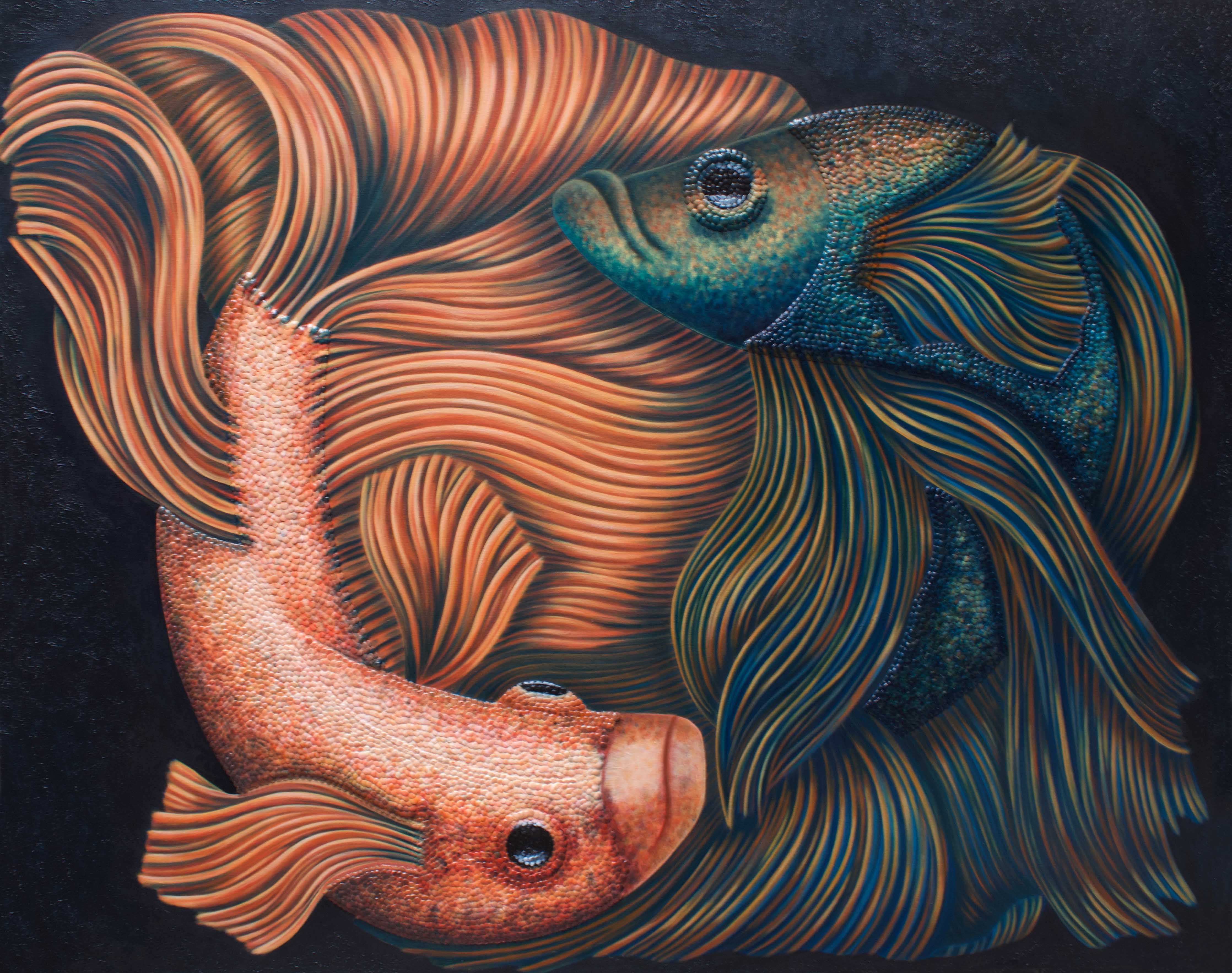 Painted between January and February of 2018, Gabriela Gil found herself reflecting on perfectionism and balance during this time. On one side, her technical skills had visibly improved; however, she also found herself very caught up in the details, striving towards perfection vs. excellence. The color palette and positioning of the fish are reflective of this idea of balance, of the two side of things, and finding harmony between two opposites.