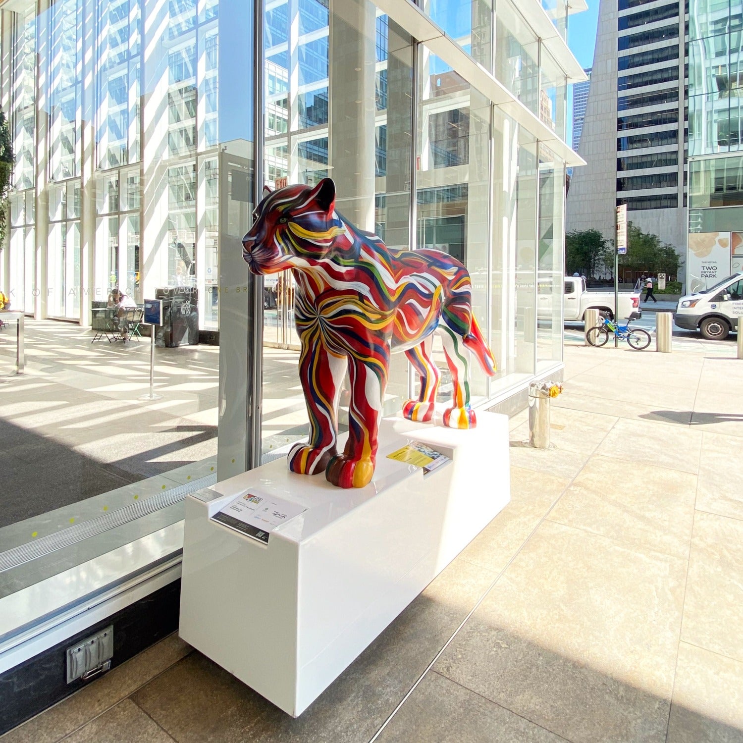 "The Path of the Jaguar" seeks to encapsulate some of the incredible legacy of the American zoologist, Dr. Alan Rabinowitz, to help save the jaguar through his efforts at Panthera, and beyond. The core inspiration is traits shared by both jaguars and Dr. Rabinowitz: fearlessness, vision, connectivity, and movement. The color palette comprises the 7 sacred colors of the Mayans to reference the importance this pre-Columbian civilization placed on the jaguar, as well as the impact the indigenous cultures had in Dr. Rabinowitz's journey through the Americas. The end result is a vibrantly-colored Jaguar standing tall with swerves of brushstrokes flowing from its fearless eyes and courageous heart, looking to the future with determination, hope, and resilience.