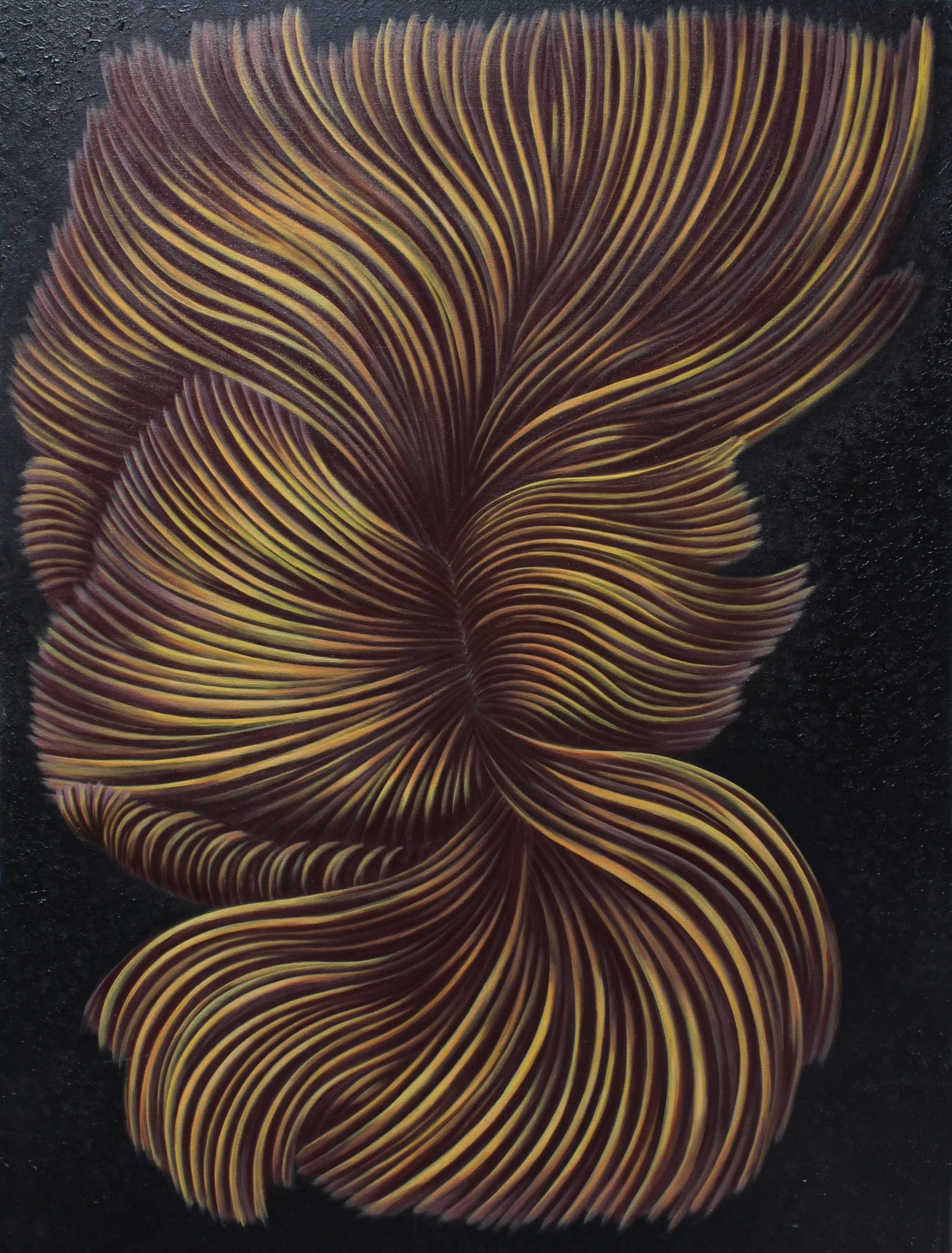This was the first abstract composition Gabriela made since beginning the Siamese series, and relied entirely on color to create space and light. It is a highly detailed piece, and the last one where Gabriela documented the hours she took to paint it on the back side (42 hours). This practice was something that she began doing during the first year of the Siamese series as a way to keep track of her path towards what some say is the level of mastership in any given practice: 10,000 hours.
