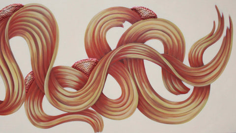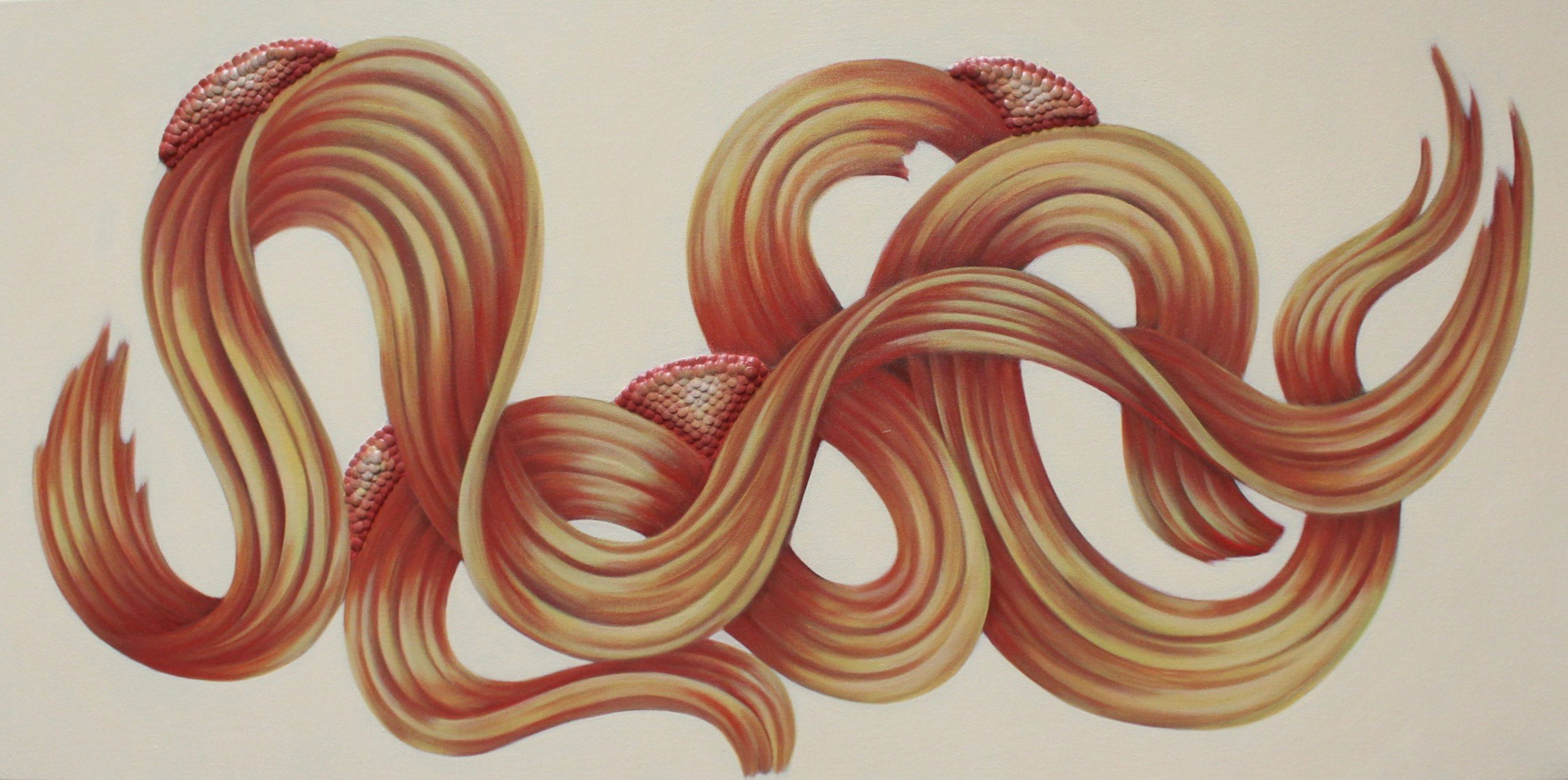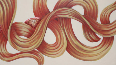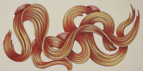 This is one of the studies Gabriela Gil made to experiment different techniques prior to working on the last three paintings of the Siamese series. This marked the first time during the series where she began moving away from dark colors, and began experimenting with a lighter background.