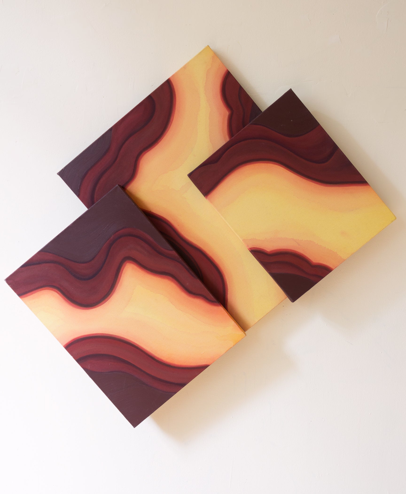 This piece is part of an exploration of caves Gabriela Gil began in 2019. It is largely inspired by Antelope Canyon in Arizona, which she visited at the beginning of 2018 as part of a road trip of 1,981 miles she did. When standing inside the canyon, you see the lines made by nature after hundreds of years of water and sand gushing through the canyon; and then when you look up there is nothing but the light that creeps in. Depending on the angle at which the light hits, the canyon walls can appear orange, red, purple, or grey. It is one of the most beautiful places in the United States.