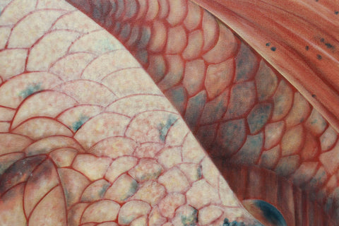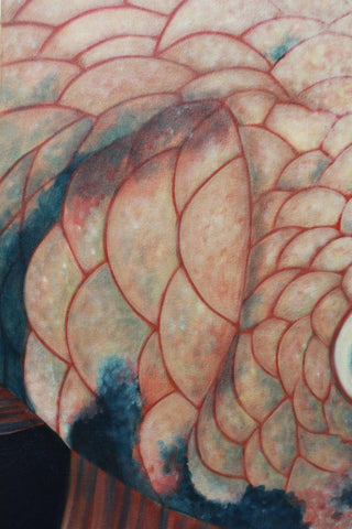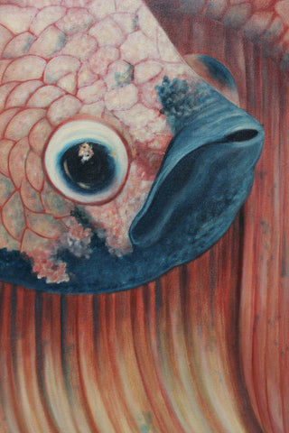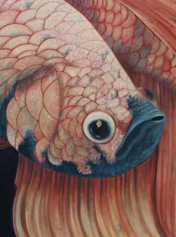 This is one of the studies Gabriela Gil made to experiment different techniques prior to working on the last three paintings of the Siamese series. In this particular piece, she relied entirely on paint to create texture, space, and light. This marked the first time she removed metal from the fish, and it was during this piece that she developed the patching technique she would later carry on to future pieces.
