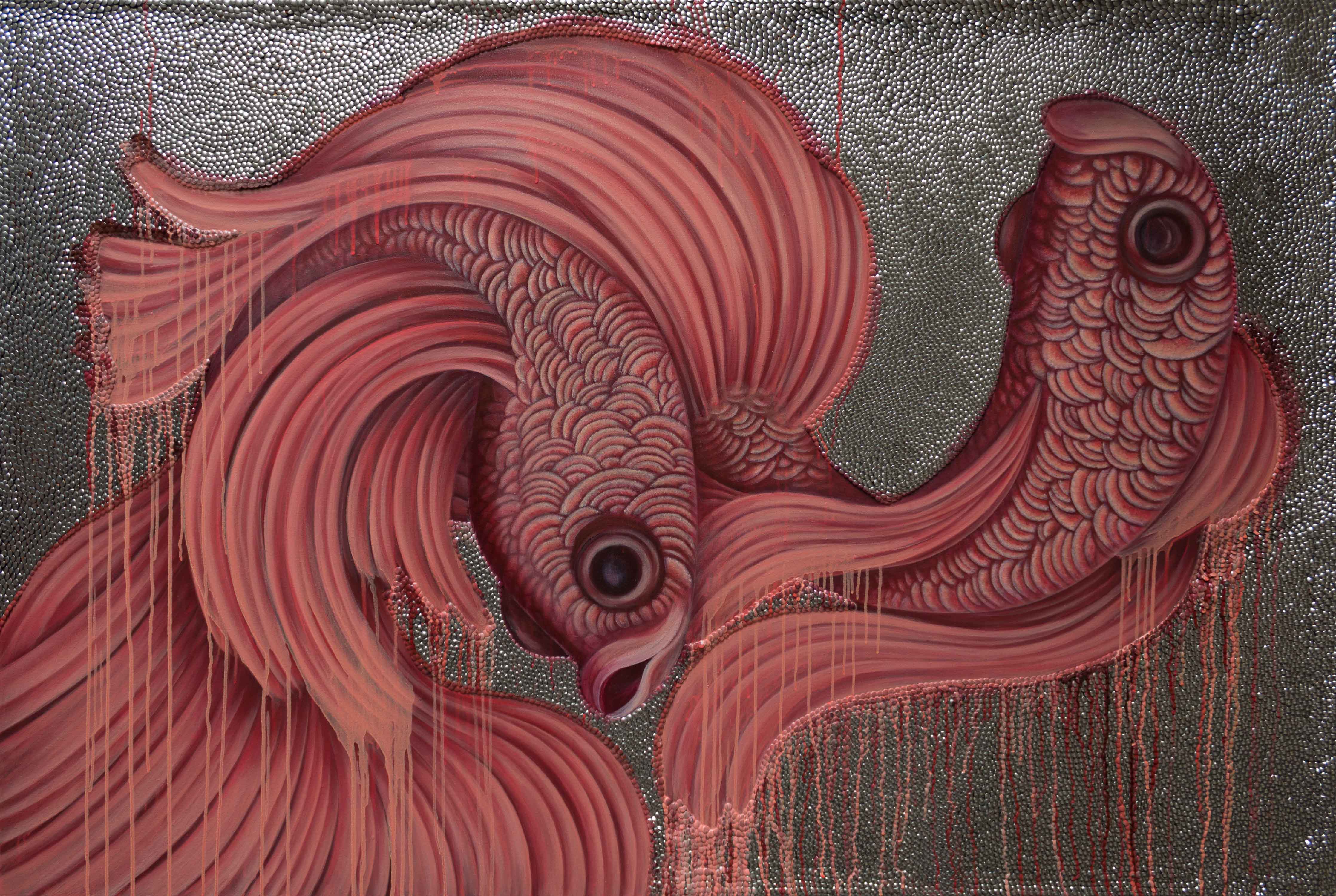 This was the last piece of the Siamese series. Gabriela Gil painted it between July and September of 2018 as she prepared for her first solo exhibition in San Francisco. For this piece the most noticeable difference is the reversal of the metal patchwork from the body of the fish, to the background. The original idea of the metal bodies was to convey the strength and body armor of a warrior. However, one of the main reflections Gil had when finalizing the series was that the most important strength is the one that comes from within. Therefore, she wanted to convey the fish breaking through the metal with movement, rawness, and passion. This marked an important breakthrough in her practice because it reflected the learnings she had acquired over the previous three years, and it also set the stage for the next series as she explored different techniques in the application of paint, and material.