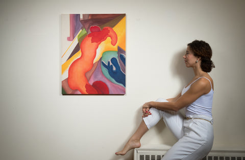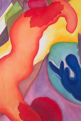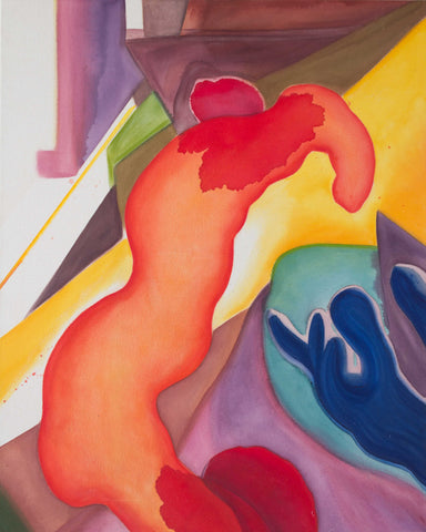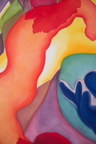 This piece is the second abstraction of a "Bird of Paradise" plant. For this one Gabriela Gil used a technique of staining raw canvas to create the entire composition, and the sense of light.