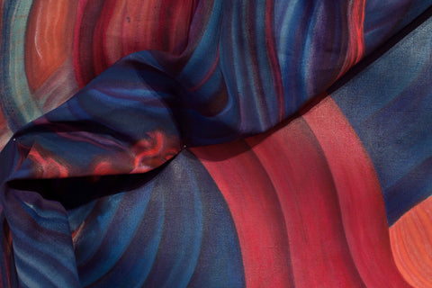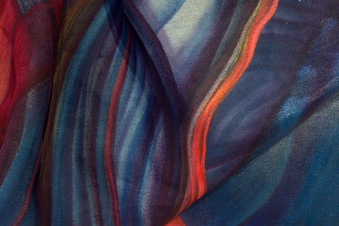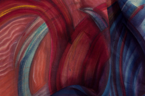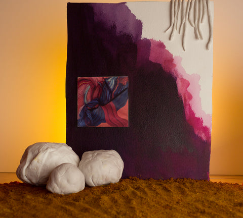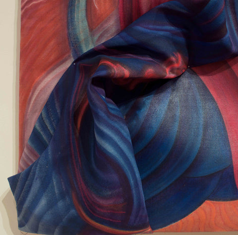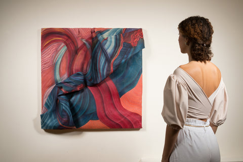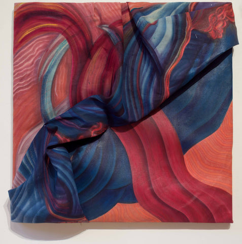 This piece sits between the realm of painting and sculpture. A slow-developing piece, it was heavily influenced by the social interactions and observations Gabriela Gil had during a research trip to Cuzco, Peru at the end of 2018. Gil had previously experimented using painting as an object, and incorporating 3D objects in the surface, however, this was the first time she sculpted a previously painted fabric to form the piece.