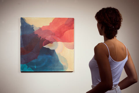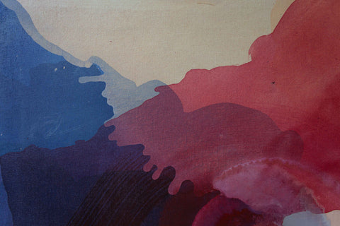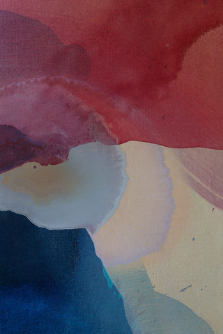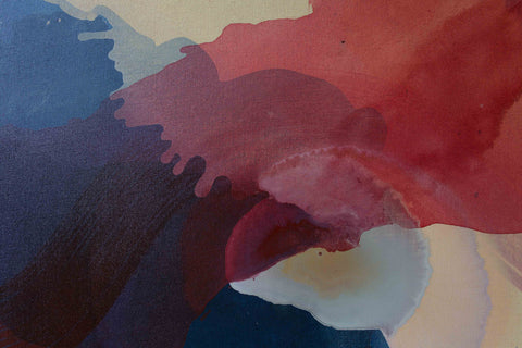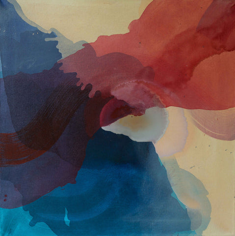 Multiple stains come together to create this piece inspired by water, and its flow. However, the multi-layered surface of color and texture leaves it open to interpretation from an emotional and mental perspective.