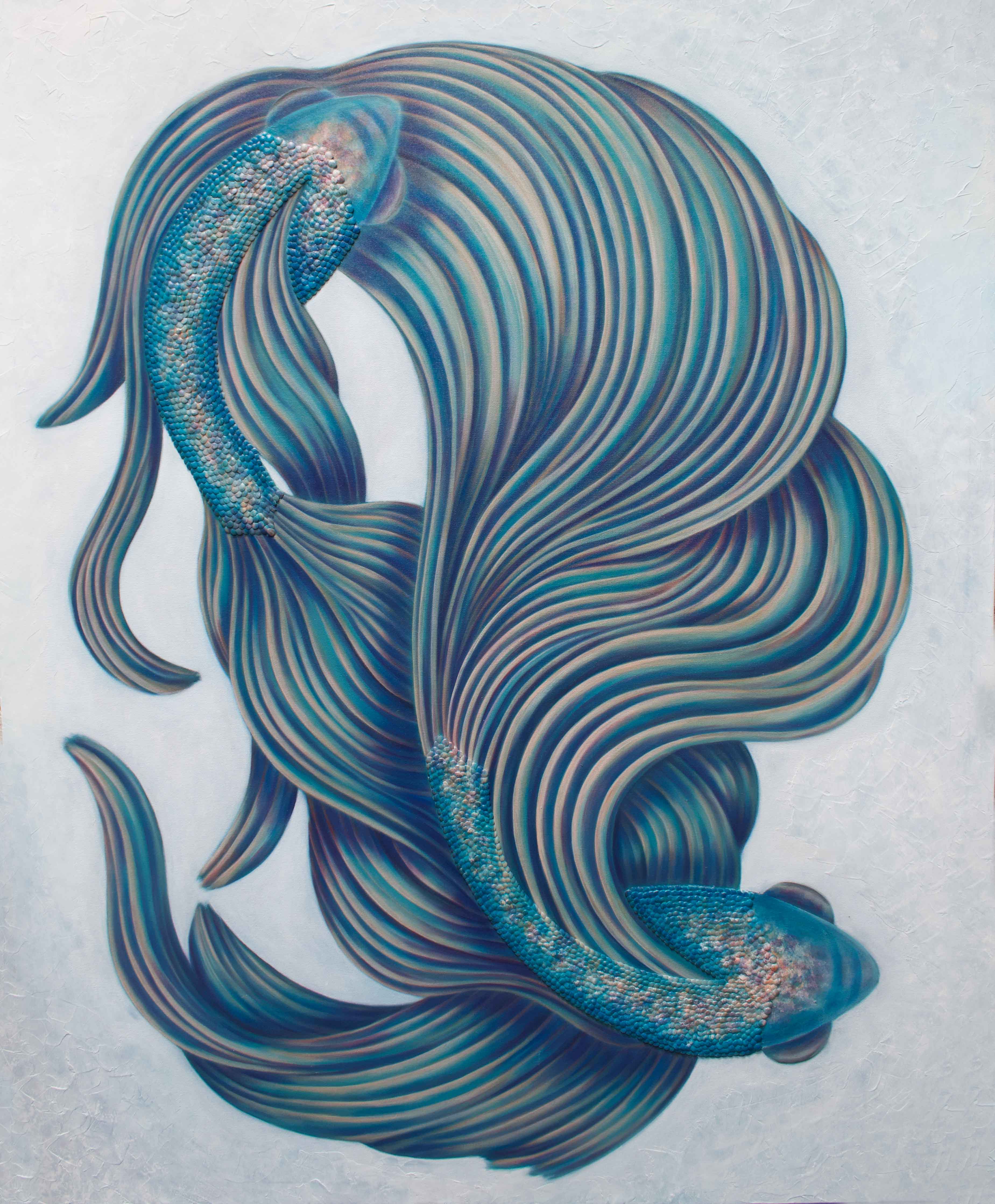 Following the learnings from the seven Siamese studies, and continuing to build on Siamese 16, Gabriela Gil painted this piece between May and June of 2018. The interlacing of the identical fish, and the long fins create more movement and harmony than in many of the previous pieces. This perhaps was reflective of a more relaxed and flowing mindset at the time.