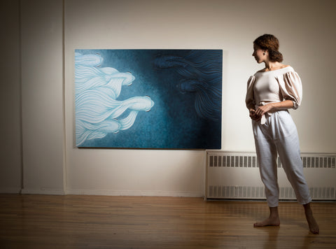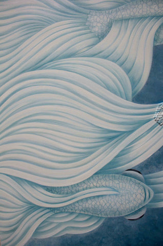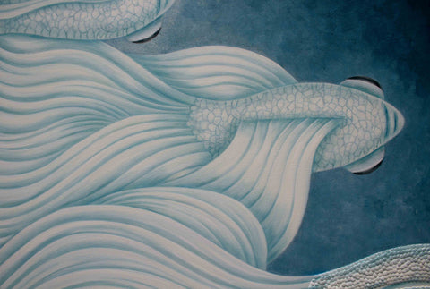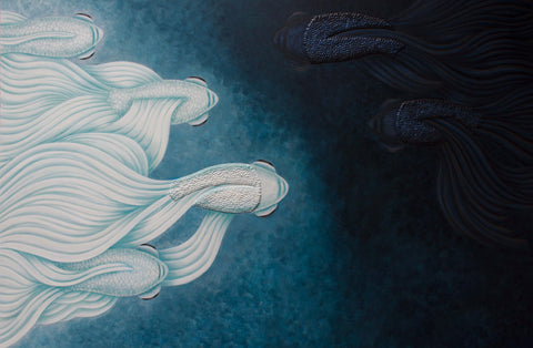 Gabriela Gil painted this piece between June and July of 2018. The idea of reconciling the extremes into harmony had been present in the series in several occasions. Through Siamese 18, she explored this by including six fish swimming towards each other, by using two contrasting color palettes, by removing the metal patchwork form some of the bodies for the first time, and by using metallic paint that would only be visible when light reflected off of it. It is a multi-layered piece, not only technically, but also in the different interpretations or narratives the viewer can get from it.