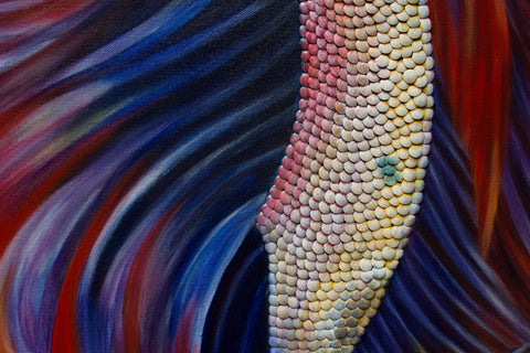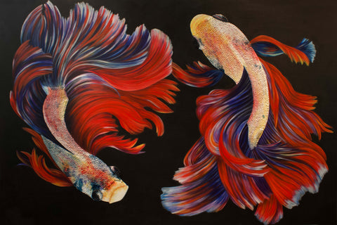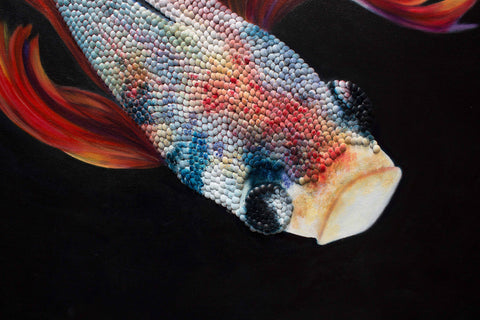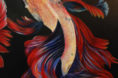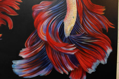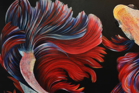 This piece was completed after an influential trip to Spain on September 2016 where Gabriela Gil was reintroduced to the work of Joan Miró and Pablo Picasso, experienced a deeply moving flamenco dance in an underground cafe in Valencia, and spent some time in the Mediterranean coast. After this trip, she wanted to capture some of these experiences, emotions, and energy. This was the first piece where she painted the entire body of the fish, and started including more than one. It marked a major breakthrough in the series.